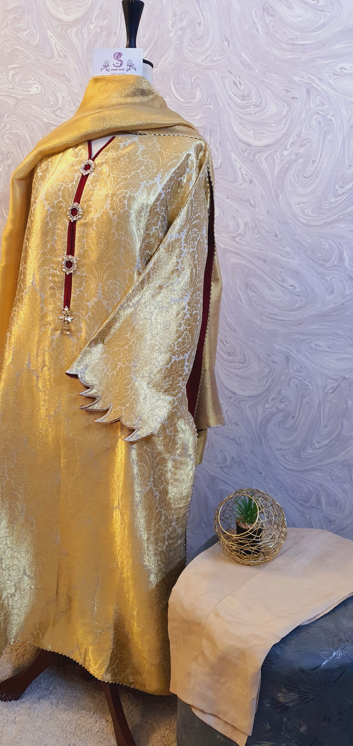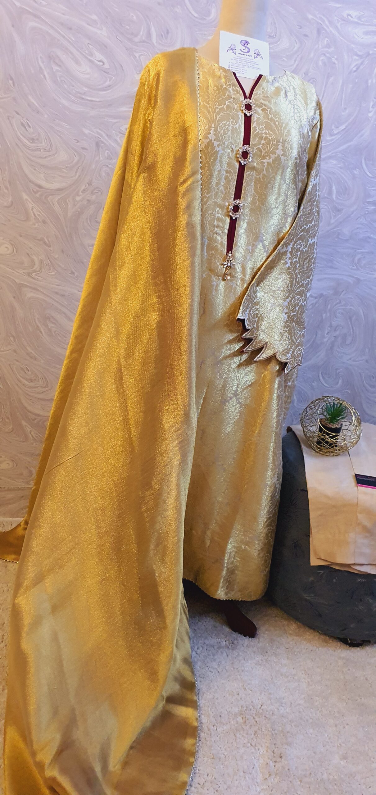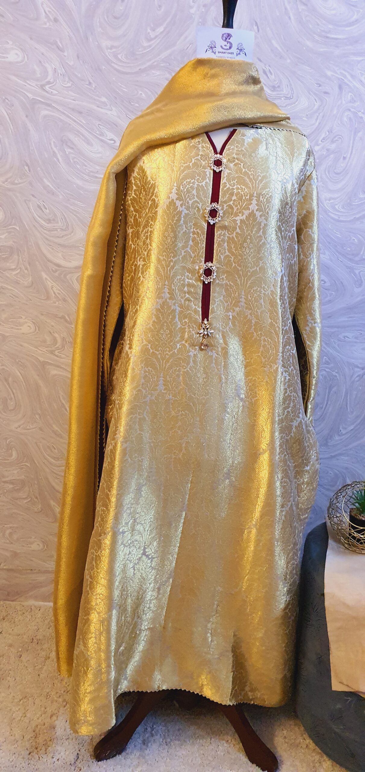 The pure silk net shawl completes the look with maroon silk facing underneath.