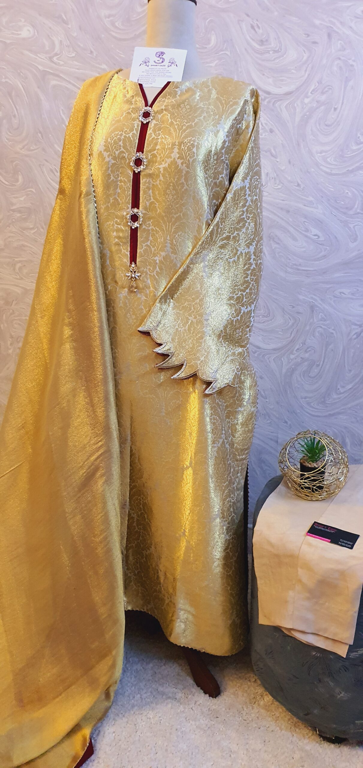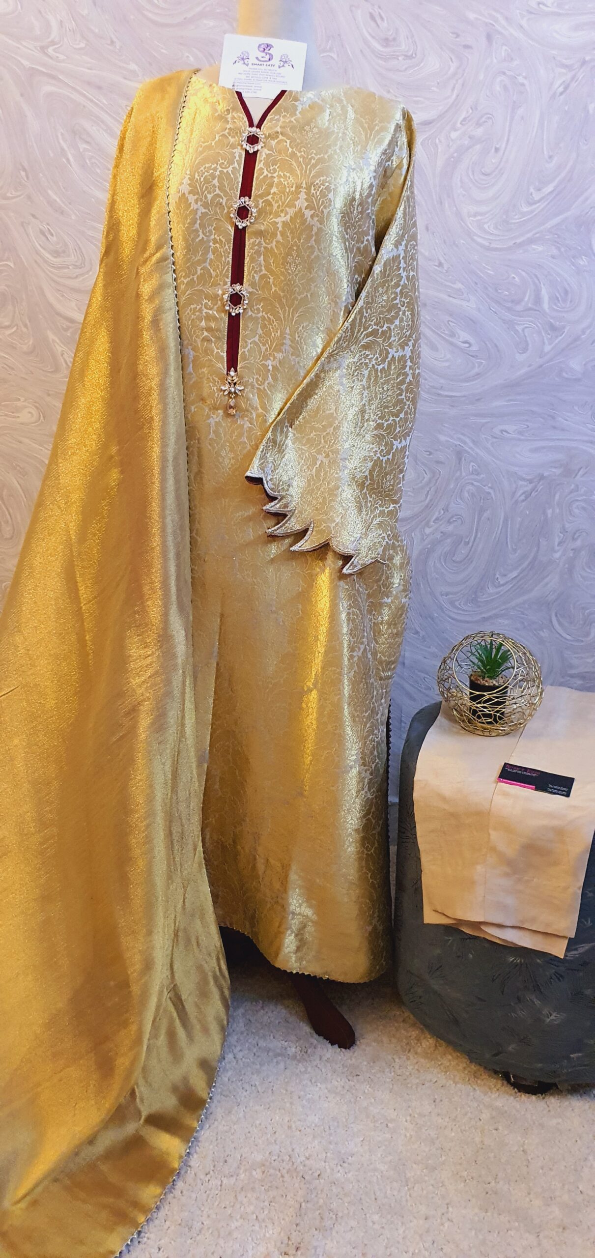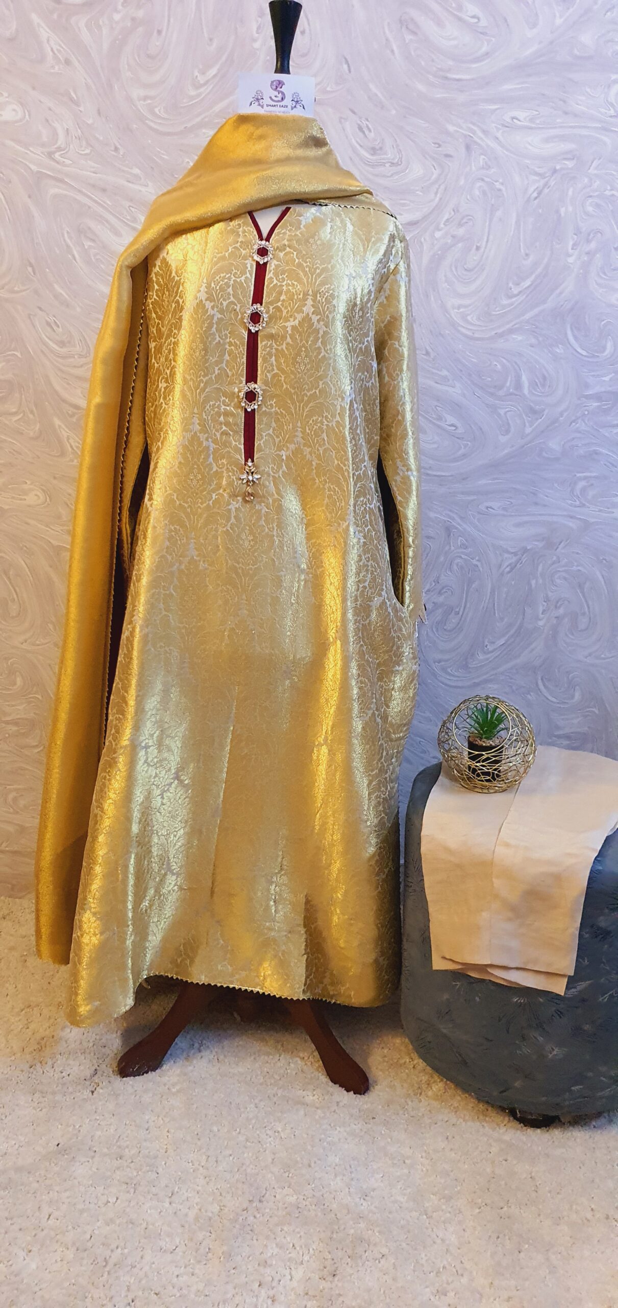 The pure silk net shawl completes the look with maroon silk facing underneath.