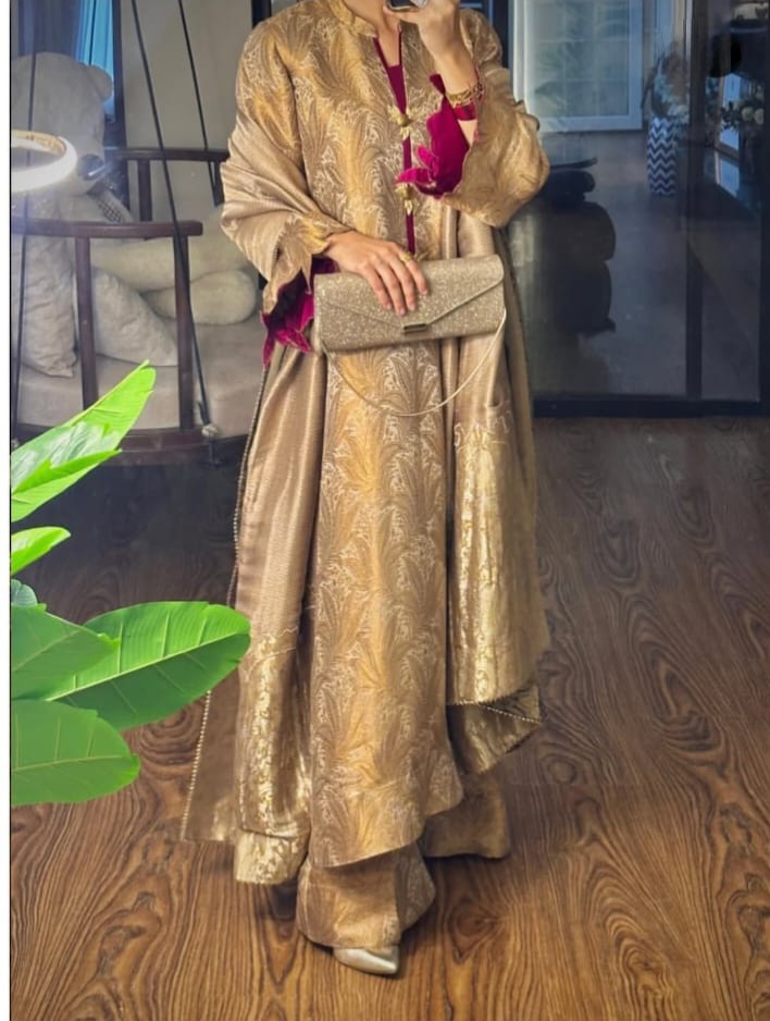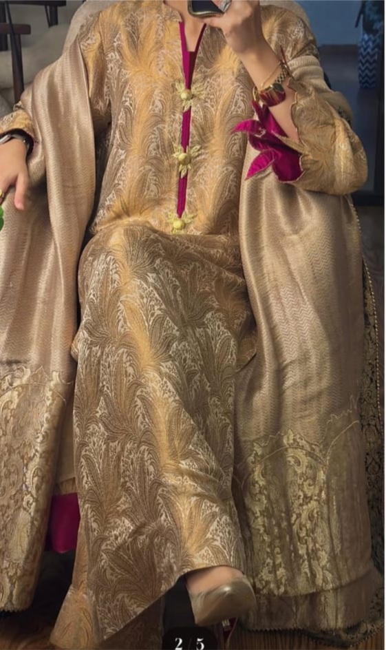 This 3pc set is crafted entirely from pure Atlas fabric .The straight cut long shirt is tailored to a length of 48 inches The neckline features crystal swaroski buttons .The sleeves are adorned with intricate cutwork detailing offering a subtle touch of artistry that Elevates the overall design .